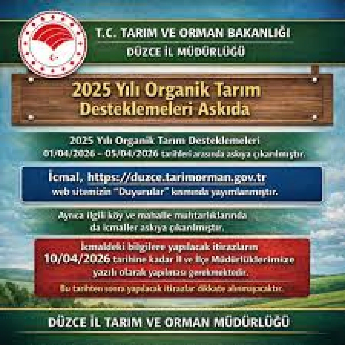 2025 Yılı Organik Tarım Desteklemeleri 01/04/2026- 05/04/2026 tarihleri arasında askıya çıkarılmış olup, icmal bilgilerine aşağıdaki linkten ulaşılabilmektedir. Ayrıca ilgili köy ve mahalle muhtarlıklarında da icmaller askıya çıkarılmıştır. İcmaldeki bilgilere yapılacak itirazların 10/04/2026 tarihine kadar İl ve İlçe Müdürlüklerimize yazılı olarak yapılması gerekmekte olup daha sonra yapılacak itirazların dikkate alınmayacağının bilinmesi hususu ilan olunur.
