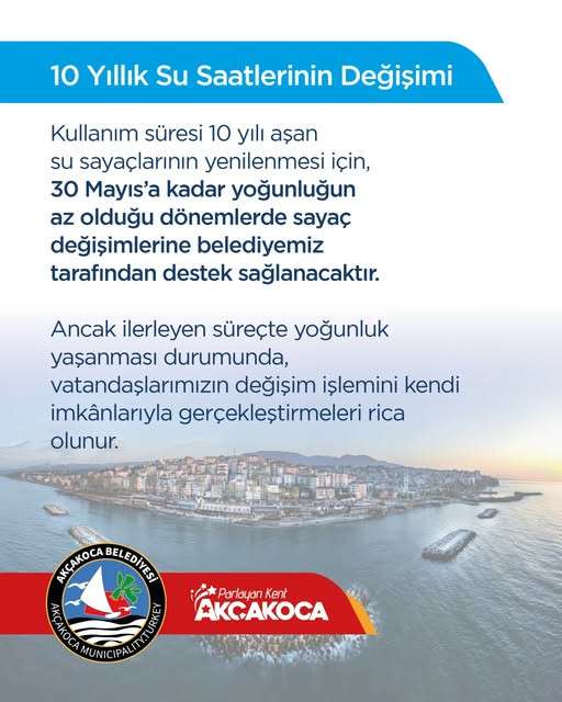 Akçakoca Belediyesi tarafından yapılan Paylaşımda, 30 Mayıs’a kadar sayaç değişimleri konusunda belediyenin teknik destek sağlayacağı, ancak bu tarihten sonra yoğunluk yaşanabileceği için vatandaşların işlemlerini kendi imkânlarıyla gerçekleştirmelerinin beklendiği ifade edildi.