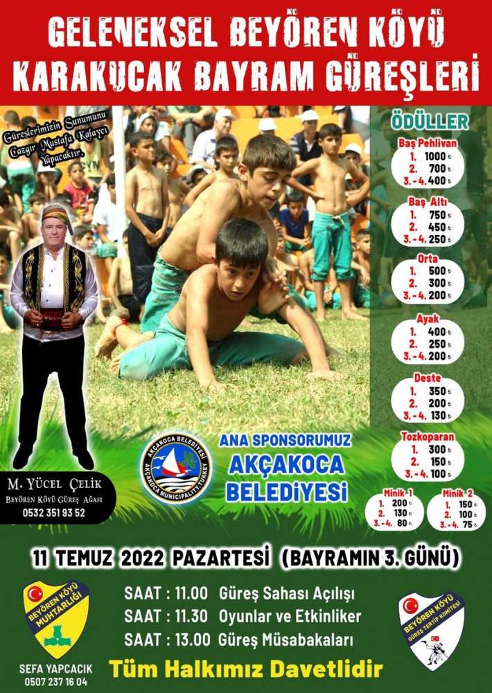 Her yıl geleneksel olarak tertip edilen ve Kurban bayramının 3. gününde yapılacak olan Beyören güreşleri 8 dalda yapılacağını belirten Eski Güreş ağası İlhan Ünal, "Her yıl ata sporumuz Güreşlerimiz tertip ediyoruz. Bu yıl Bayramın bayramının 3. günü tertip ediyoruz. Beyören köyümüzün karakucak güreşlerine her kesi davet ediyoruz. 8 kategoride yapılacak yarışmalar sonrasında nakdi ve ayni ödüller vereceğiz. Akçakoca Belediyesinin yardımları olmakta, Güreşlerimizde ki ikramlarımızı Belediyemiz tarafından yapılacak'' dedi.
