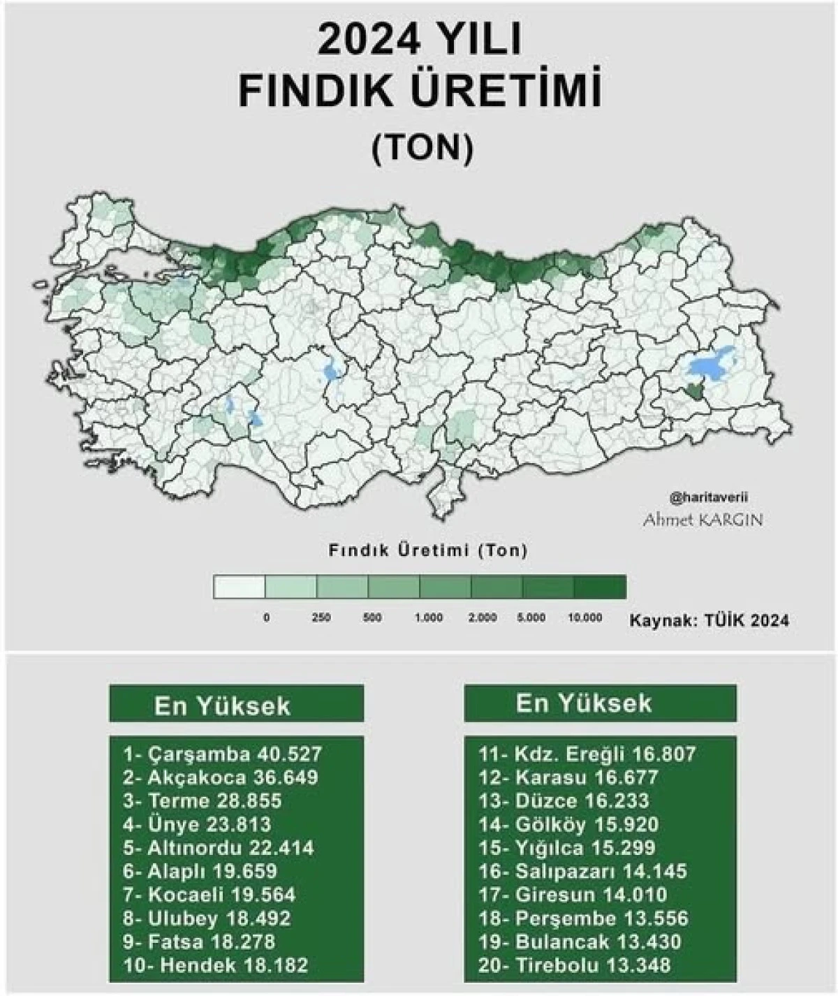 Fındık üretiminde ilk sırayı 40 bin 527 tonla Samsun’un Çarşamba ilçesi alırken, Ünye 23 bin 813 tonla üçüncü, Altınordu 22 bin 414 tonla dördüncü, Terme ise 21 bin 115 ton üretimle beşinci sırada yer aldı. Alaplı, bu ilçelerin ardından 19 bin 659 ton üretimle altıncı sıraya yerleşti. Kdz. Ereğli ise 16 bin 807 ton üretimle 11. sırada yer aldı.