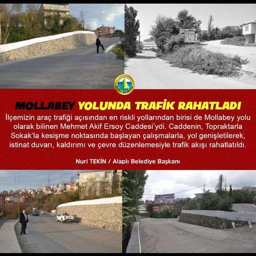 Alaplı belediye başkanı Nuri Tekin Alaplı için son sürat çalışmalarına devam ediyor yıllardır yapılamayan Mollabey yolunun trafiğini rahatlatan çalışmalarını tamamlayan başkan Tekin çalışmalarla ilgili şunları söyledi"İlçemizin araç trafiği açısından en riskli yollarından birisi de Mollabey yolu olarak bilinen Mehmet Akif Ersoy Caddesi’ydi. Caddenin, Topraktarla Sokak’la kesişme noktasında başlayan çalışmalarla, yol genişletilerek, istinat duvarı, kaldırımı ve çevre düzenlemesiyle trafik akışı rahatlatıldı."dedi