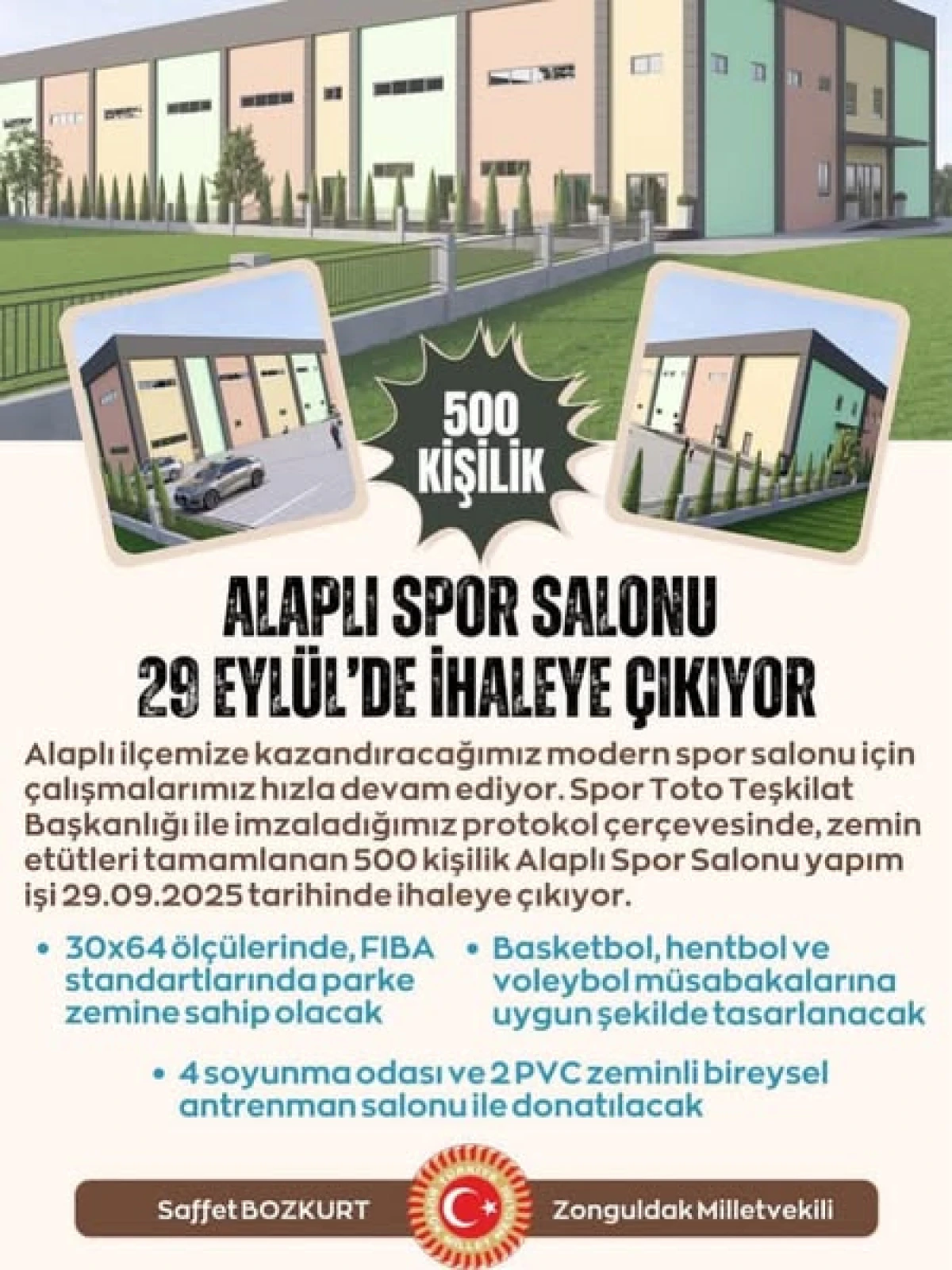 Zonguldak Milletvekili Saffet Bozkurt konuyla ilgili olarak; “Alaplı ilçemize kazandıracağımız modern spor salonu için çalışmalarımız hızla devam ediyor. Spor Toto Teşkilat Başkanlığı ile imzaladığımız protokol çerçevesinde, zemin etütleri tamamlanan 500 kişilik Alaplı Spor Salonu yapım işi 29.09.2025 tarihinde ihaleye çıkıyor.