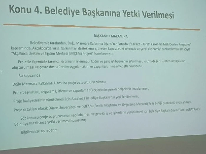 Toplantıda konuşan Akçakoca Belediye Başkanı Fikret Albayrak, devam eden projelerin kararlılıkla sürdüğünü belirterek şunları söyledi: