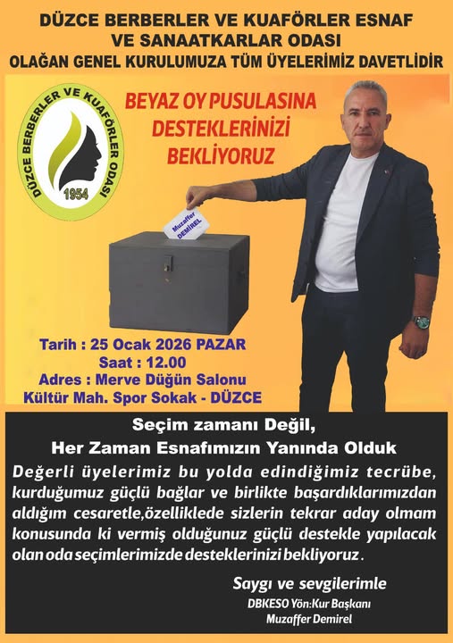 Tüm Üyelerimizi ve meslektaşlarımızı Düzce Berberler ve Kuaförler Esnaf ve Sanatkarlar Odası Başkanlık Seçimi’ne katılmaya davet ediyoruz.