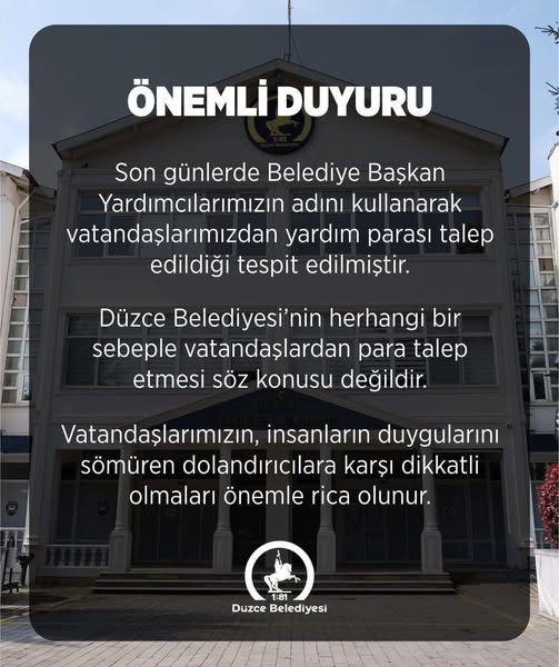 Düzce Belediyesi, başkan yardımcılarının adını kullanan kişilerin yardım parası istediğini belirterek vatandaşları dolandırıcılığa karşı uyardı.
