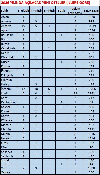 Yatırım maliyetlerinin artmaya devam etmesi, kredi faizlerinin geçen yıl olduğu gibi yüksek seyretmesi, krediye ulaşmadaki zorluklar, Ortadoğu’daki karışıklıklar, Rusya Ukrayna savaşının devam etmesi ve Türkiye’deki siyasi gelişmelerin geleceğe dair belirsizlikleri artırması vb. nedenler 2026 yılında açılması beklenen yeni otel projelerinin ya beklemeye alınmasına ya da tamamen iptal edilmesine neden olduğu belirtildi. 17 adet olan bu otellerden 6’sı beş yıldızlı, 7’si dört yıldızlı, 3‘ü üç yıldızlı ve 1’i butik otel sınıfındadır. Bu tesislerin toplam yatak sayısı ise 3 bin 804’ü buluyor.