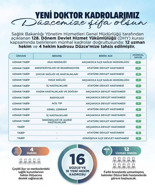 Vekil Öztürk şunları aktardı:Yeni doktor kadrolarımız Düzce’mize şifa olsun… Sağlık Bakanlığı Yönetim Hizmetleri Genel Müdürlüğü tarafından açıklanan 128. Dönem Devlet Hizmet Yükümlülüğü (DHY) kurası kapsamında belirlenen münhal kadrolar doğrultusunda; 12 Uzman Hekim 4 Hekim olmak üzere toplam 16 yeni hekim kadrosu Düzce’mize tahsis edilmiştir. Özellikle İmmünoloji ve Alerji Hastalıkları branşında ilimizde ilk kez kadro açılması, vatandaşlarımızın daha önce farklı illerde almak zorunda kaldığı bu önemli sağlık hizmetinin artık Düzce’mizde sunulacak olması açısından son derece kıymetlidir. Bu gelişme, hem teşhis hem de tedavi süreçlerinde ilimizin sağlık kapasitesine önemli bir katkı sağlayacaktır. Sağlığa yapılan her yatırımın doğrudan insan hayatına dokunduğunun bilinciyle, ilimizde sağlık hizmetlerinin niteliğini artırmaya kararlılıkla devam ediyoruz. Destekleri için Cumhurbaşkanımız Sayın Recep Tayyip Erdoğan’a ve Sağlık Bakanımız Sayın Kemal Memişoğlu’na teşekkür ediyorum.