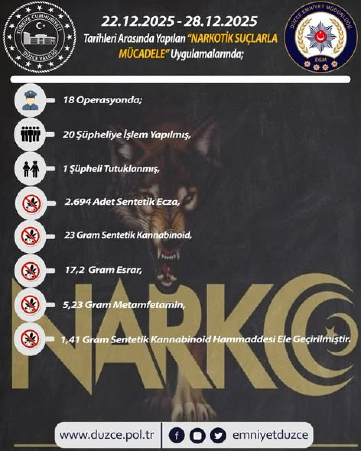 Düzce İl Emniyet Müdürlüğü ekiplerince 22–28 Aralık 2025 tarihleri arasında il genelinde yürütülen trafik, asayiş, narkotik ve organize suçlarla mücadele uygulamalarında önemli sonuçlar elde edildi.