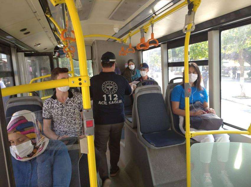 Toplu taşıma araçlarında yapılan denetimlerde yolcu sayısı, maske kullanımı ve fiziki mesafeye uyulup uyulmadığı kontrol edildi. Sürücü ve yolculardan tedbirlere riayet edilmesi hususunda destek istendi.