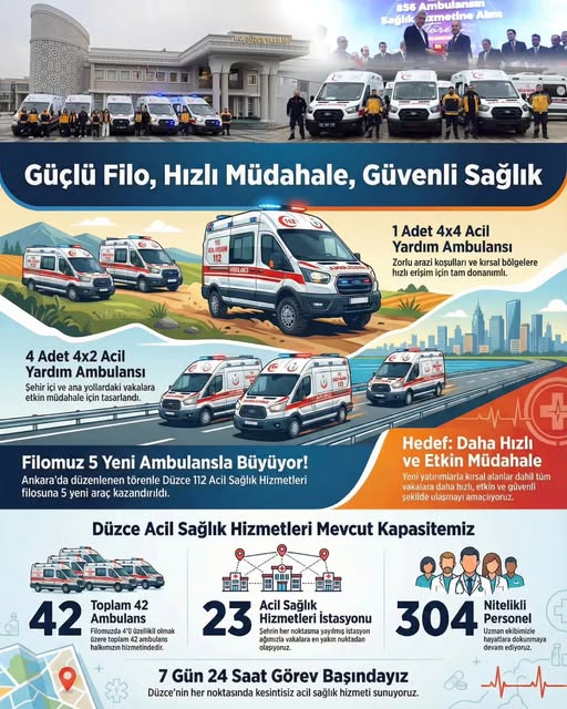 Düzce İl Sağlık Müdürlüğü' 4’ü özellikli olmak üzere toplam 42 ambulans, 23 Acil Sağlık Hizmetleri İstasyonu, 304 nitelikli personel ile şehrimizin her noktasında 7 gün 24 saat esasına göre hayatlara dokunmaya devam ediyor.