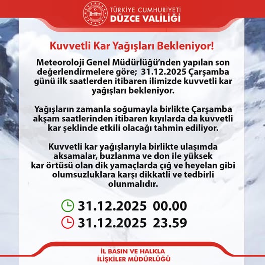 Meteoroloji Genel Müdürlüğü, 31 Aralık 2025 Çarşamba günü itibarıyla Düzce genelinde etkisini artıracak kuvvetli kar yağışına karşı uyarıda bulundu