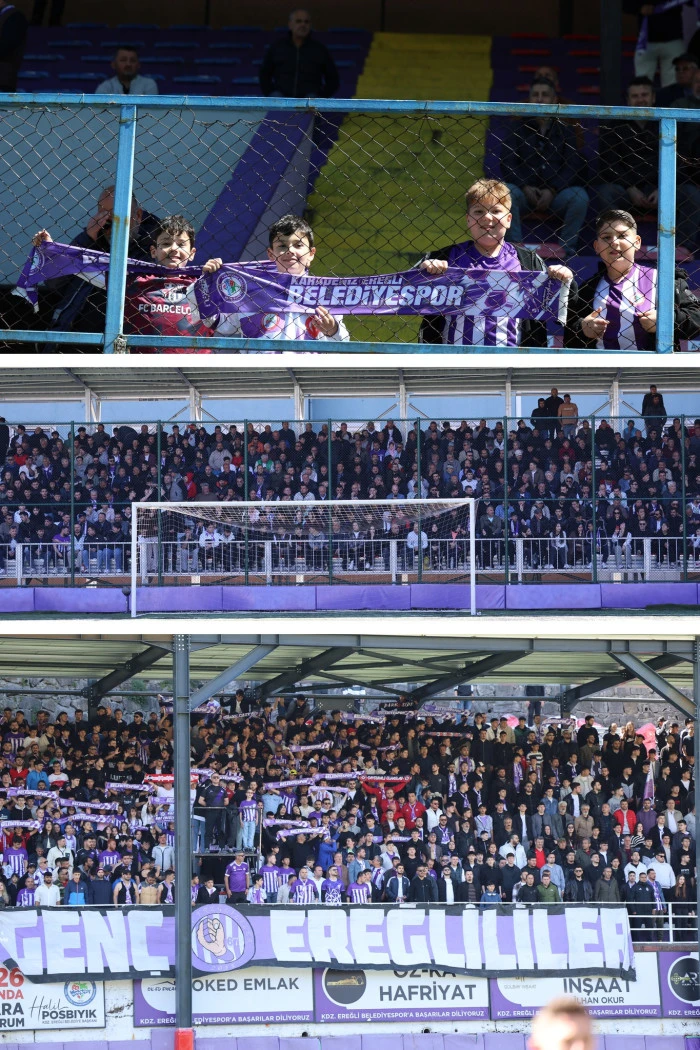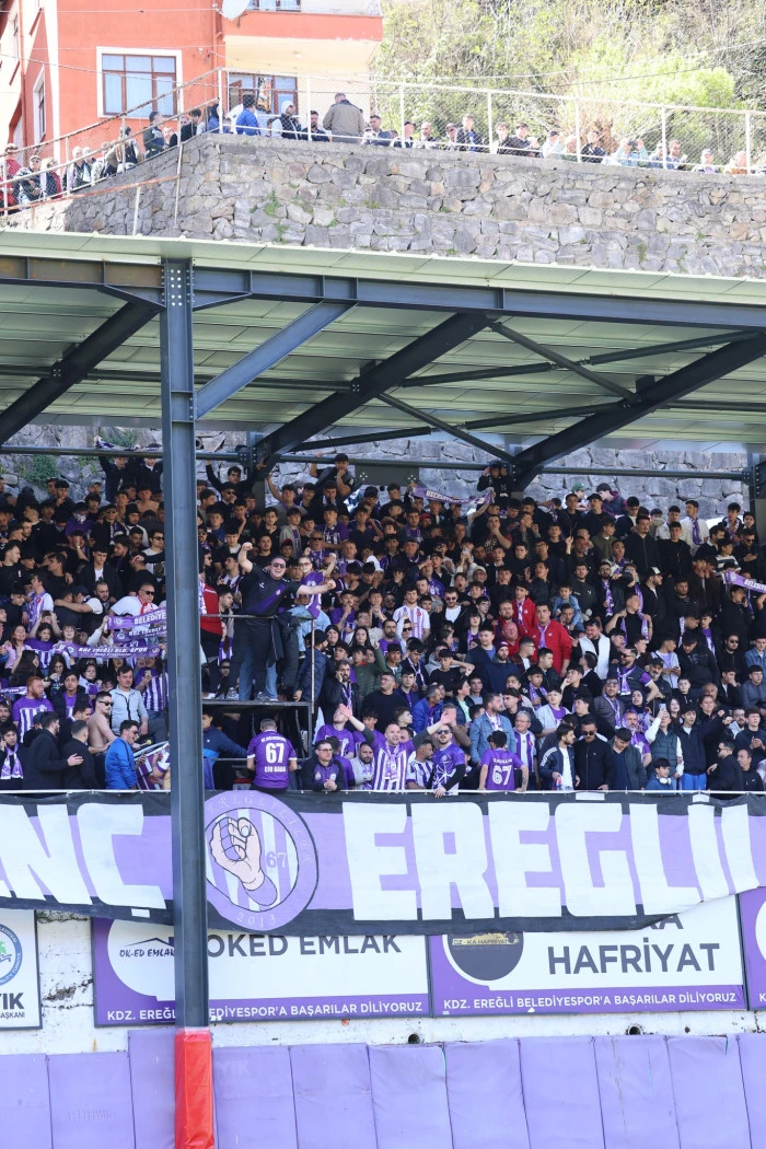 Ereğli Belediyespor’un 12’nci adamı taraftar, bugün Beyçayırı sahasında oynanan rövanş maçında tribünleri full doldurdu.Stadın bütün çevresi,ağaçların üzerine çıkanlar,evlerinden maçı takıp edenler,tıklı tıklı stadı doldurarak takımlarını desteklediler. Eflatun-Beyazlı taraftara, Zonguldakspor taraftarı da destek verdi. Müthiş bir tribün yapan Ereğli Belediyespor taraftarı, takımın Play-Off’tan elenmesi üzerini büyük üzüntü yaşadı.Bu seyirciye yazık oldu