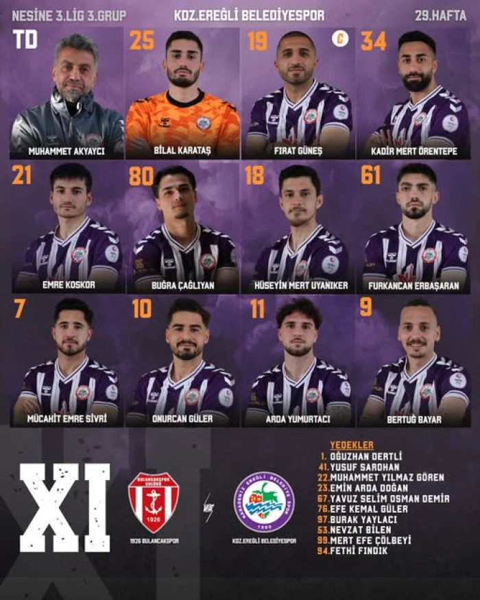Kdz. Ereğli Belediyespor: Bilal, Fırat, Emre, Kadir Mert, Buğra (Efe dk. 30), Mücahit Emre (Mert Efe dk. 71), Onurcan, Arda (Fethi dk. 71), Hüseyin Mert (Yusuf dk. 61), Furkan Can, Bertuğ )