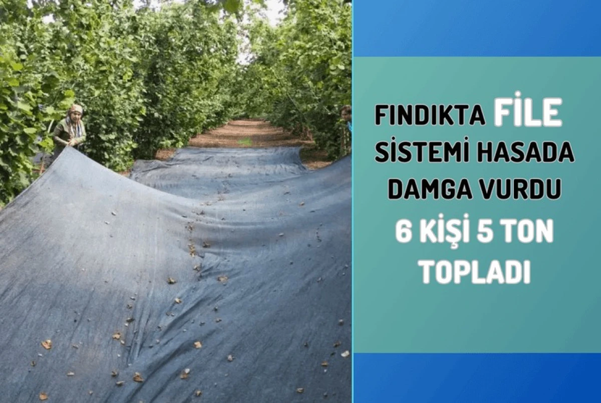 Fındıkta file sistemi hasada hız ve tasarruf getirdi. Çarşamba’da 6 kişi bir günde 5 ton fındık toplarken, üreticiler yevmiye masraflarından kurtuldu.