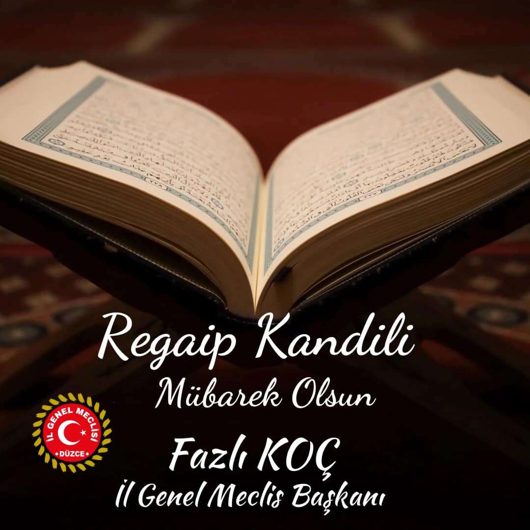 Düzce İl genel meclis başkanı Fazlı Koç, , Regaib Kandili dolayısıyla bir mesaj yayımlayarak, hemşehrilerinin ve tüm İslam âleminin kandilini kutladı.