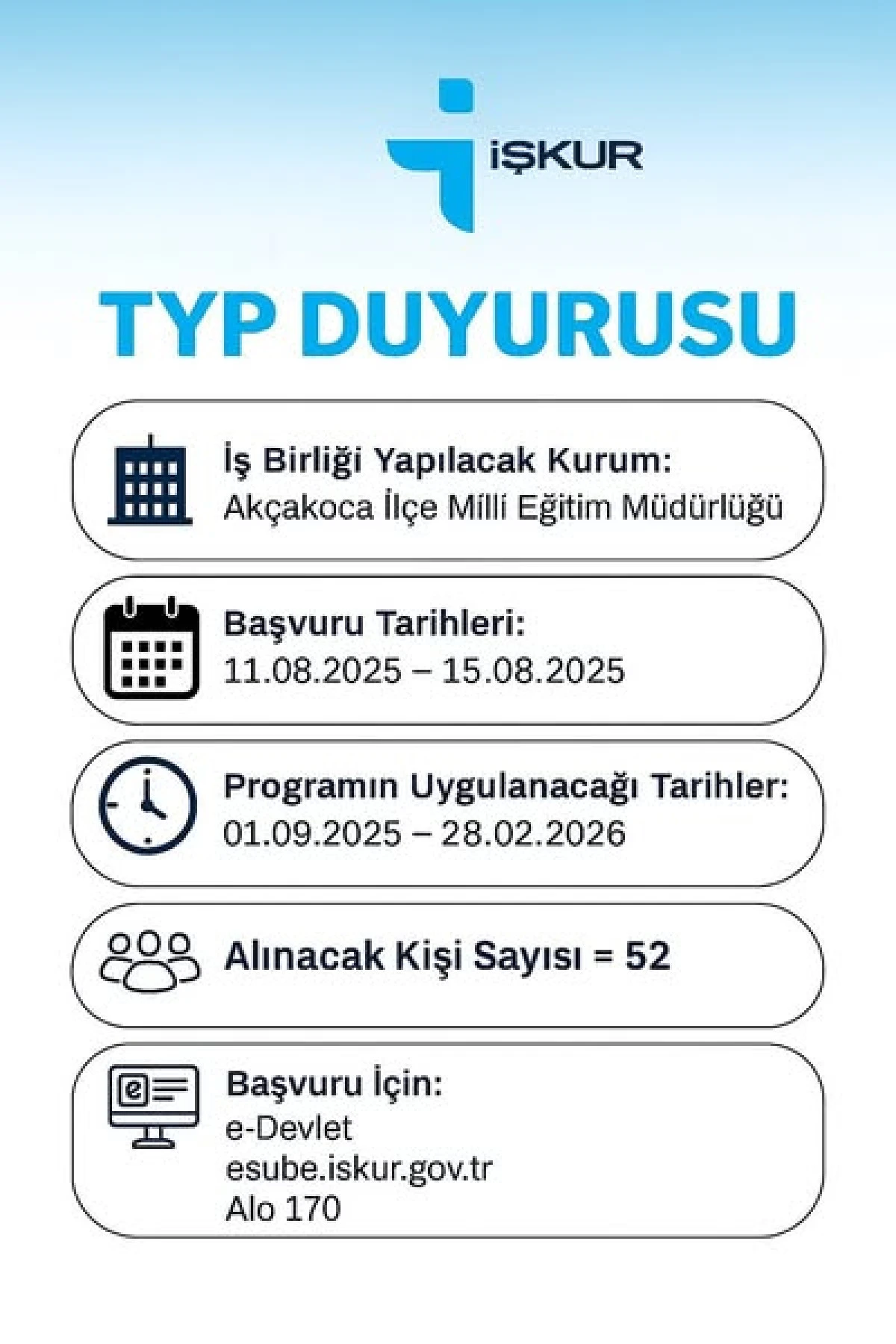 İŞKUR AKÇAKOCA MİLLİ EĞİTİMDE ÇALIŞACAK ELEMAN ARIYOR