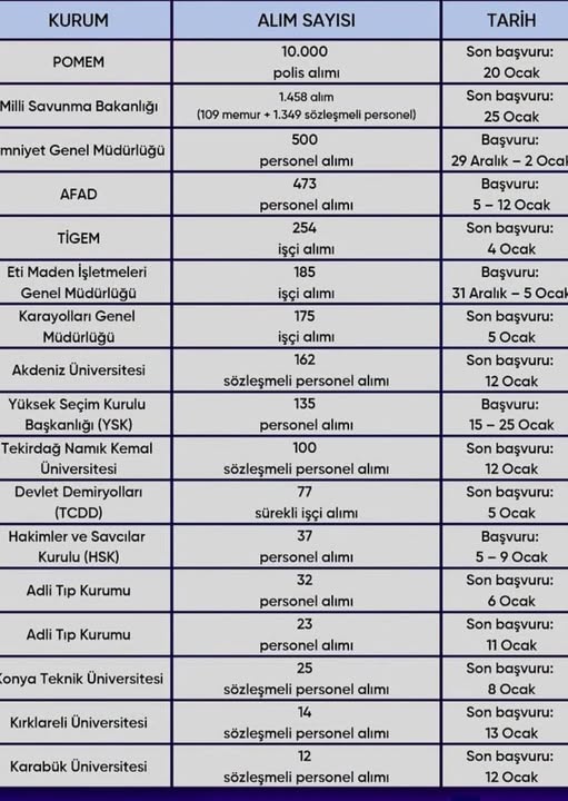 Ayrıca Adli Tıp Kurumu için iki ayrı ilan kapsamında 32 ve 23 personel alımı yapılacak. Bu alımlar için son başvuru tarihleri 6 Ocak ve 11 Ocak olarak açıklandı.