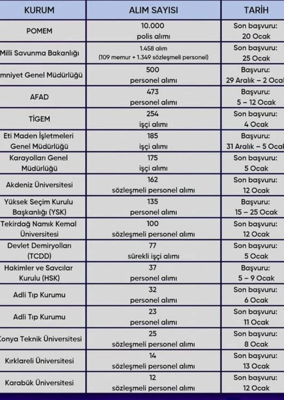Başvuru tarihleri kurumlara göre değişiklik gösterirken, bazı ilanlarda son başvuru tarihleri ocak ayı içinde sona erecek.