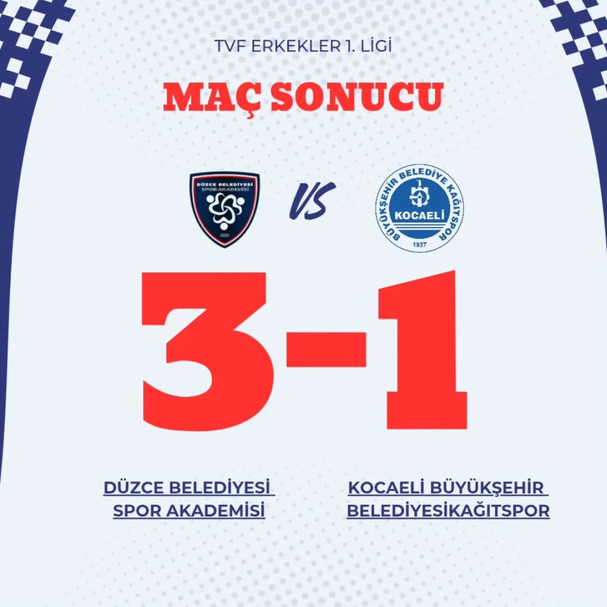 2025-2026 sezonunda ilimizi Erkekler birinci Voleybol liginde temsil eden Düzce Belediyespor Kocaeli Büyükşehir Belediye Kağıtspor'u 3-1 yendi.
