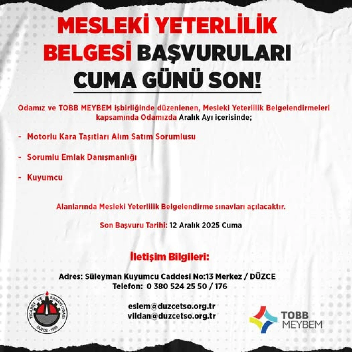 Düzce Ticaret ve Sanayi Odamız ile TOBB MEYBEM işbirliğinde düzenlenen Mesleki Yeterlilik Belgelendirmeleri kapsamında Motorlu Kara Taşıtları Alım Satım Sorumlusu, Sorumlu Emlak Danışmanı, Kuyumcu Alanlarında Mesleki Yeterlilik Belgelendirme sınavları açılacaktır.