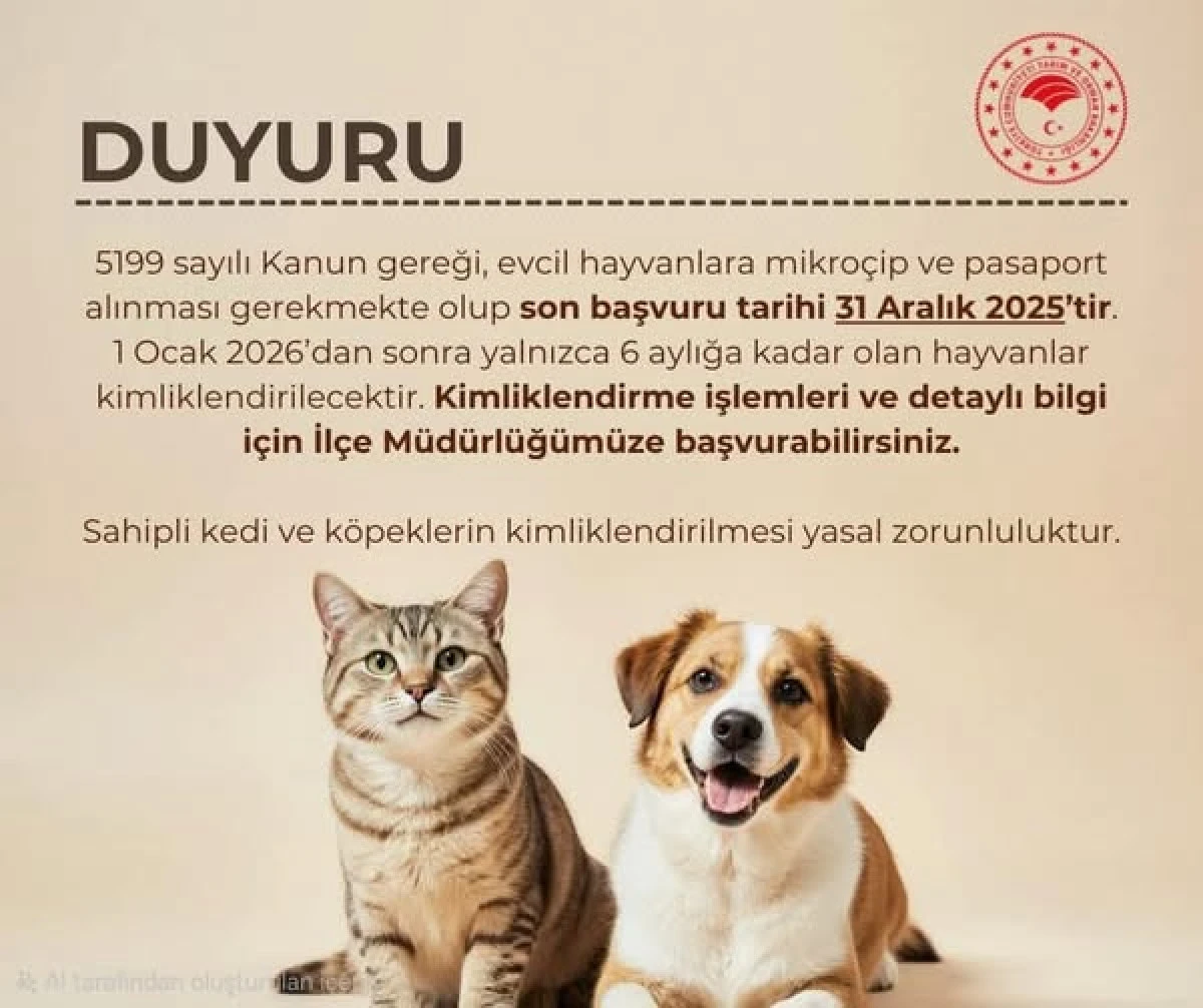 1 Ocak 2026 tarihinden sonra, yalnızca 6 aylıktan küçük hayvanlar kimliklendirilecek, süresi geçen başvurular kabul edilmeyecektir.