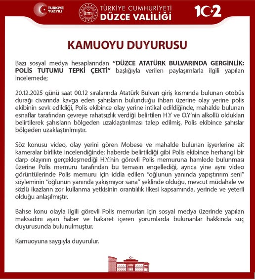 Düzce Valiliği’nden yapılan açıklamada, olay ile ilgili olarak bilgilere verilerek “Bazı sosyal medya hesaplarından “Düzce Atatürk Bulvarı’nda Gerginlik. Polisin tutumu tepki çekti” başlığıyla verilen paylaşımlarla ilgili yapılan incelemede; 20 Aralık 2025 günü saat 00.12 sıralarında Atatürk Bulvarı giriş kısmında bulunan otobüs durağı civarında kavga eden şahısların bulunduğu ihbarı üzerine olay yerine polis ekibinin sevk edildiği, Polis ekibince olay yerine intikal edildiğinde, mahalde bulunan esnaflar tarafından çevreye rahatsızlık verdiği belirtilen H.Y ve O.Y’nin alkollü oldukları belirtilerek şahısların bölgeden uzaklaştırılması talep edilmiş, Polis ekibince şahıslar bölgeden uzaklaştırılmıştır. Söz konusu video, olay yerini gören Mobese ve mahalde bulunan işyerlerine ait kameralar birlikte incelendiğinde; haberde belirtildiği gibi Polis ekibince herhangi bir darp olayının gerçekleşmediği H.Y.’nin görevli Polis memuruna hamlede bulunması üzerine Polis memuru tarafından bu temasın engellediği, ayrıca yine aynı video görüntülerinde Polis memuru için iddia edilen ‘’oğlunun yanında yapıştırırım seni’’ söyleminin ‘’oğlunun yanında yakışmıyor sana’’ şeklinde olduğu, mevcut müdahale ve sözlü ikazların zor kullanma yetkisinin orantılılık ilkesi kapsamında, yerinde ve yeterli olduğu anlaşılmıştır. Bahse konu olayla ilgili görevli Polis memurları için sosyal medya üzerinde yapılan maksadını aşan haber ve hakaret içeren yorumlarda bulunanlar hakkında suç duyurusunda bulunulmuştur” denildi.