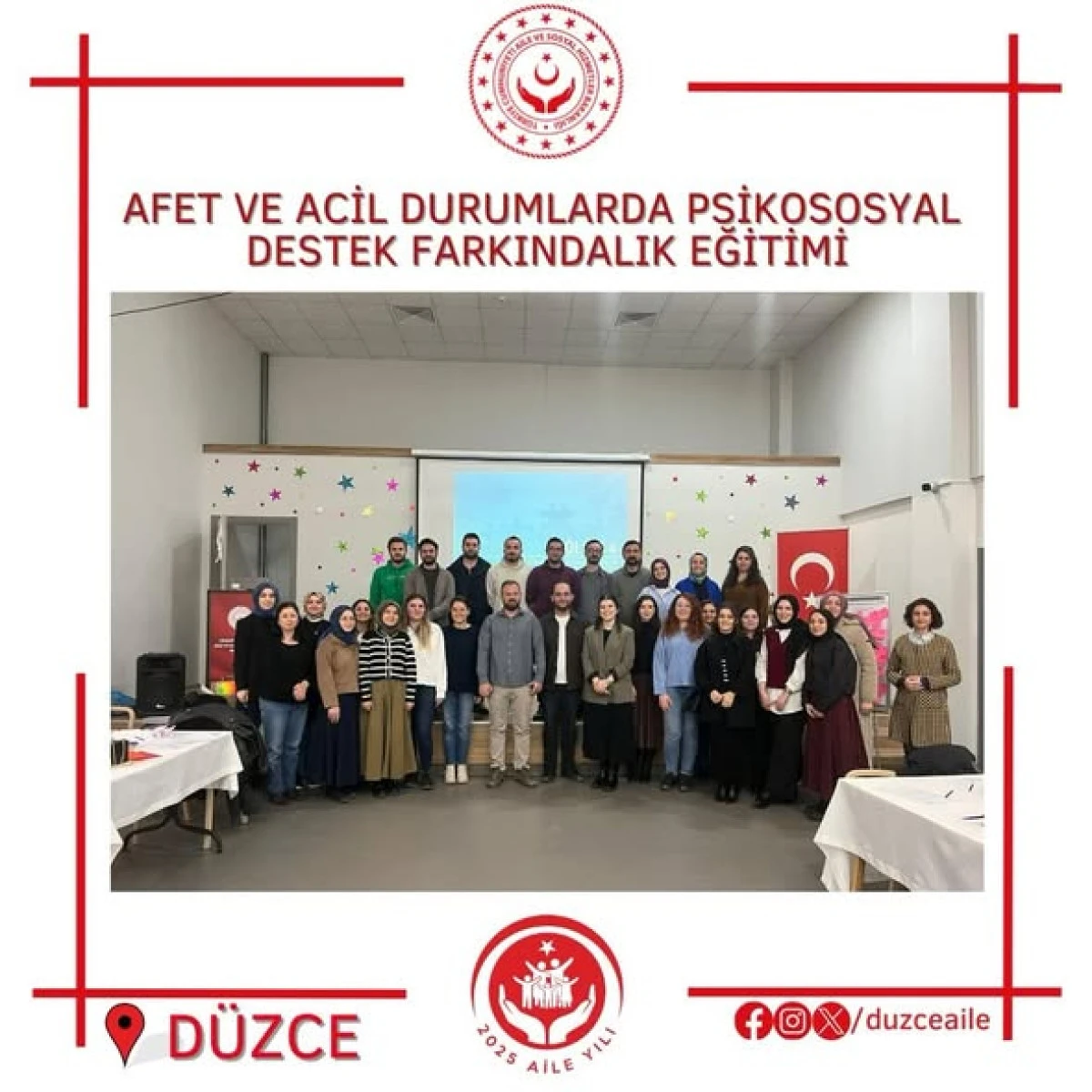Aile ve Sosyal Hizmetler İl Müdürlüğü koordinesinde, Müdürlüğü Psikososyal Destek Eğiticileri tarafından; afet ve acil durumlarda psikososyal destek hizmetlerinin önemine dikkat çekmek amacıyla, Yerel Düzey Afet Psikososyal Destek Grubu Operasyonel Planı kapsamında görevli İl Sağlık Müdürlüğü, İl Milli Eğitim Müdürlüğü, Gençlik ve Spor İl Müdürlüğü, Düzce Belediyesi ile Müdürlüğümüz bünyesinde görev yapan Psikolojik Danışman/Rehber Öğretmenlere (PDR), sosyal çalışmacı, psikolog ve sosyologlara yönelik Afet ve Acil Durumlarda Psikososyal Destek Farkındalık Eğitimi gerçekleştirildi.