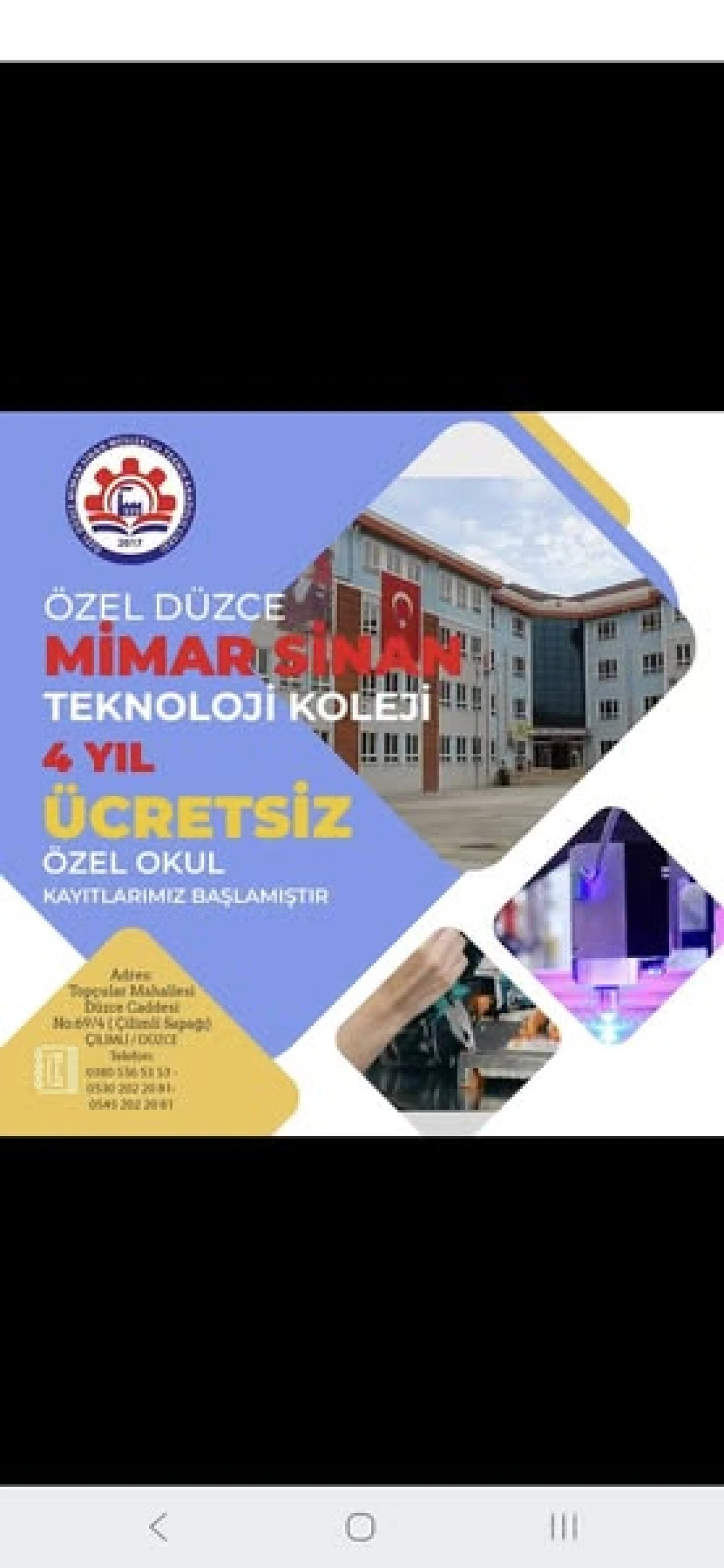 Düzce’mizde ilk olarak açılan özel Sağlık Meslek Lisesi ve Özel Mimar Sinan Teknoloji koleji siz değerli öğrencilerini bekliyor.Hiçbir masraftan kaçınılmadan kurulan okul gerçekten de mükemmel bir hizmet sunuyor.Mezunlarının iş bulma gibi bir sorunu yok mezun olduklarında hemen işe başlıyorlar.