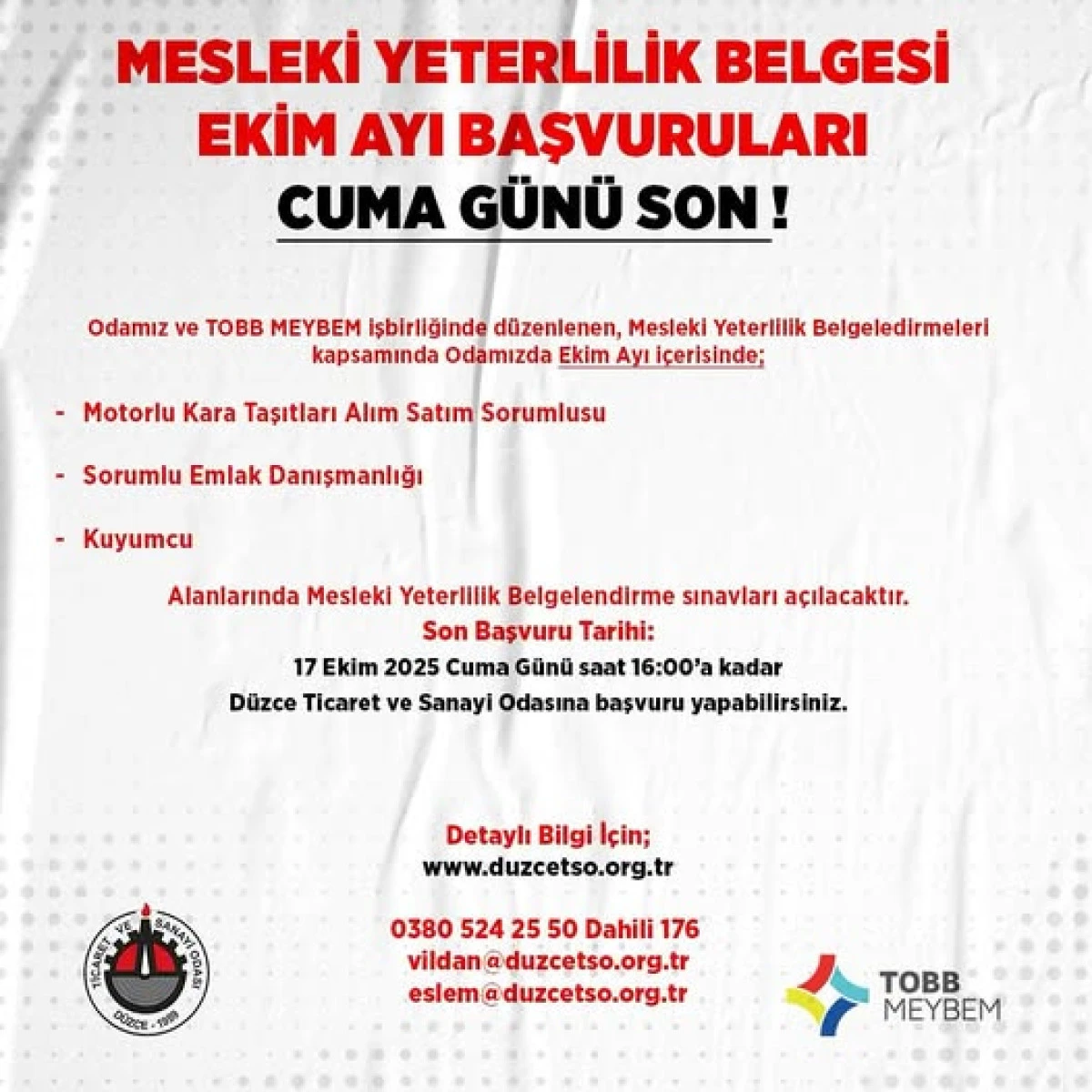 Düzce Ticaret ve Sanayi Odamız ve TOBB MEYBEM iş birliğinde, Mesleki Yeterlilik Belgelendirmeleri kapsamında Ekim ayı içerisinde Odamızda aşağıdaki alanlarda sınavlar düzenlenecektir: