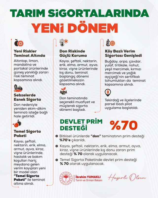 Tarım ve Orman Bakanı İbrahim Yumaklı, Resmî Gazete’de yayımlanan Cumhurbaşkanı Kararı ile tarım sigortalarında yeni dönemin başladığını, TARSİM kapsamında don teminatı ve ürün bazlı sigortaların genişletildiğini açıkladı.