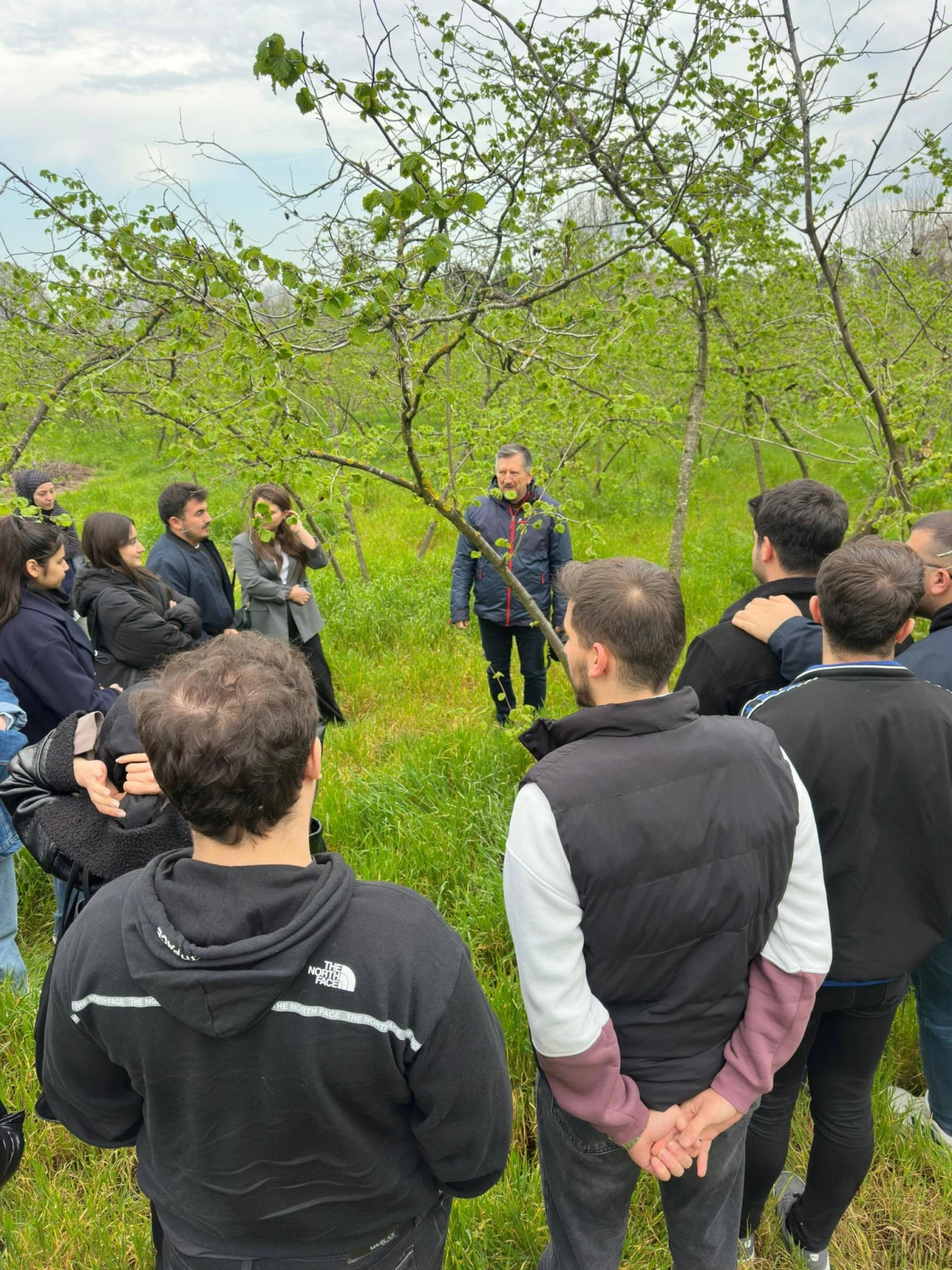 Ziyaretin uygulamalı bölümünde ise öğrencilerle birlikte odamıza ait örnek bahçeye geçilerek yerinde incelemeler yapıldı. Bahçede gerçekleştirilen gözlemler sırasında fındık bitkisinin gelişim süreci, hastalık ve zararlı belirtileri ile mücadele yöntemleri sahada gösterilerek teorik bilgilerin pratiğe dönüşmesi sağlandı.