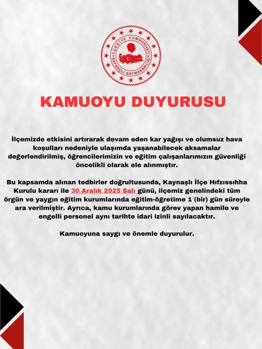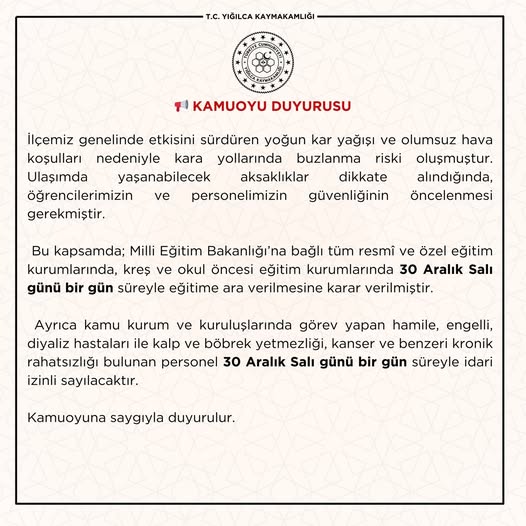 İlçemiz genelinde etkisini sürdüren yoğun kar yağışı ve olumsuz hava koşulları nedeniyle kara yollarında buzlanma riski oluşmuştur. Ulaşımda yaşanabilecek aksaklıklar dikkate alındığında, öğrencilerimizin ve personelimizin güvenliğinin öncelenmesi gerekmiştir.